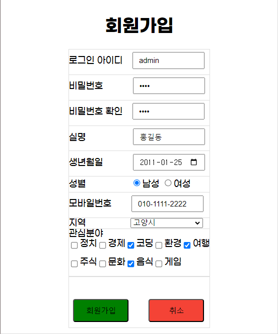세 번째로는 회원가입를 만들어봤습니다. 이제 프로젝트나 웹페이지를 만들 때 가장 많이 할거 같아서 이번 자바스크립트를 공부하면서 만들어봤습니다. 그래도 잘 동작하는 거 보니 기분은 좋네요ㅎㅎㅎㅎ
